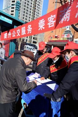 從2月21日起,首度在百貨大樓站、唐山西站、廣場站、北環(huán)樞紐站等市區(qū)客流量密集的站點(diǎn),設(shè)立咨詢臺,懸掛“提升公交服務(wù)乘客滿意度調(diào)查”條幅,工作人員頭戴小紅帽,身披綬帶,為過往乘客發(fā)放“公共交通乘客滿意度調(diào)查表”,一位乘客填完調(diào)查表后,感概的說:“這幾年咱們唐山的公交發(fā)展變化真的很大,綠色環(huán)保的空調(diào)車越來越多了,冬天不冷夏天不熱。尤其是去年的世園會夜場惠民直通車,從家門口到世園會,兩點(diǎn)一線,又惠民又方便。”許多過往的市民也在咨詢臺向工作人員主動索要調(diào)查表,大家都想為公交的發(fā)展獻(xiàn)計獻(xiàn)策。