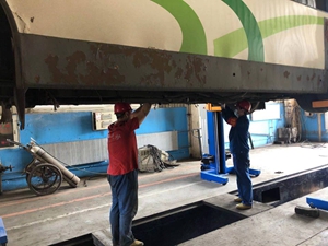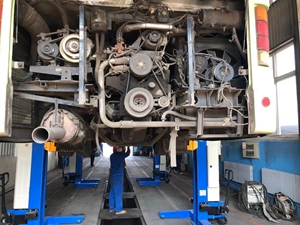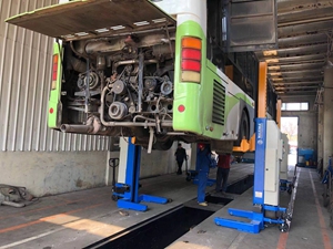 隨著新車型的疊新換代,傳統的地溝舉升已不能滿足新車型的維保需求,為更安全,便捷地進行車輛各項維保工作,總公司在資金緊張情況下,籌措資金,為修理公司購置4臺充電移動式重卡舉升機,該移動式重卡舉升機采用無線信號連接,蓄電池供電,液壓系統平穩安全舉升,不需要固定工位使用,操作人員直立地面維修,操作便捷。