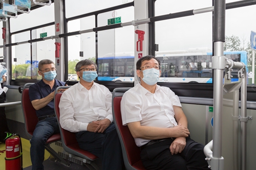 隨后,一行人登上公交車,總經理劉東占對新能源公交車的上線運營情況,充電站建設情況,新車電池續航里程、安全性等方面做了介紹。