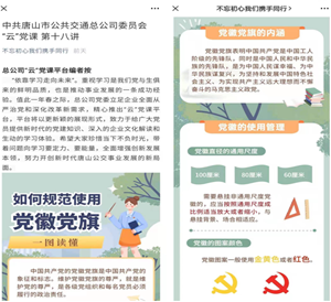 另外,總公司黨委還組織領導班子成員對《中國共產黨黨徽黨旗條例》內容進行了學習,并將如何規范使用黨旗黨徽的規定內容制作成“云黨課”,下發各基層黨組織及黨員干部進行學習。