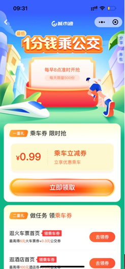 首次開通乘車的用戶,可參與活動領取【0.99元公交乘車立減券】